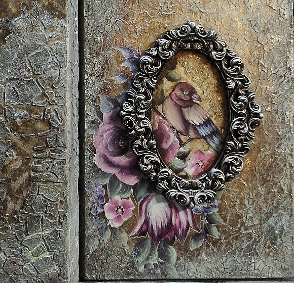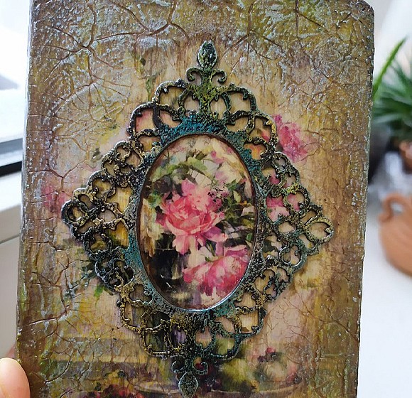 Приклеиваем рамочку и добавляем кракелюрной сетки внутри с чернением. Проходим по фактуре пальчиковыми восками-металликами. Декорируем странички методом сухой кисти более светлым тоном для выделения рельефа. Можно дополнительно покрыть полуматовым лаком фактуру. Обзор готовой работы.